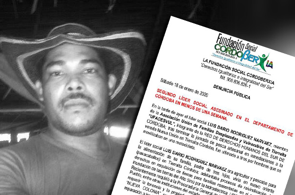 Córdoba·Tema del día Asesinado en zona rural de Tierralta sería líder social, denunció Cordoberxia 6 años atrás Se trata de Luis Darío Rodríguez Narváez, quien sería miembro de la Asociación: Unión de Familias Desplazadas y vulnerables del sur de