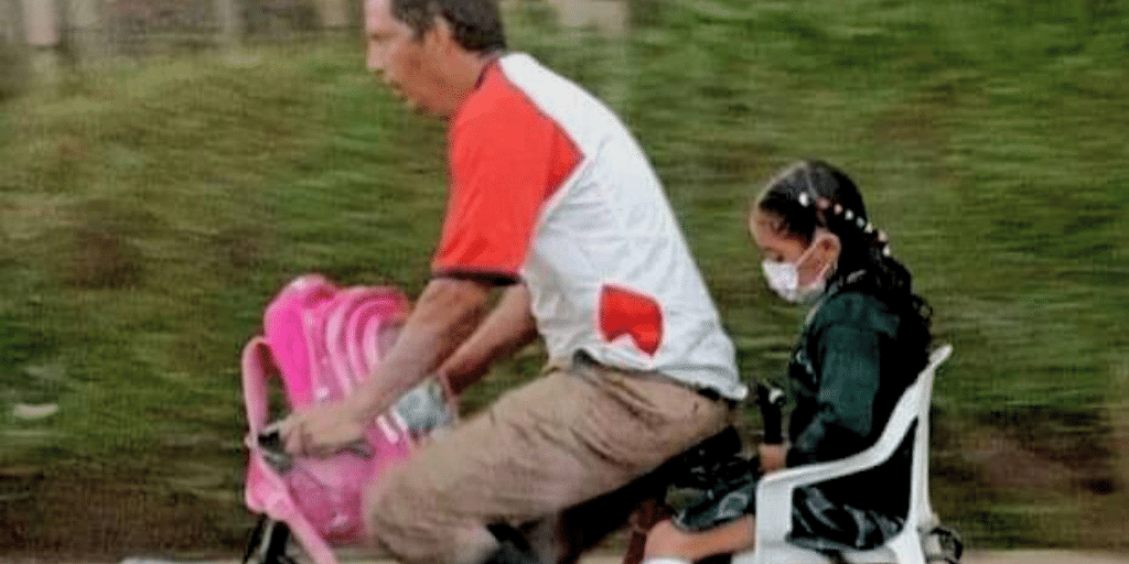 Tendencias Padre sujetó silla plástica a su ‘bici’ para llevar a su hija al colegio 4 años atrás Luego del alcance que tuvo la foto, ahora cada uno tiene una bicicleta nueva para llegar a sus labores.