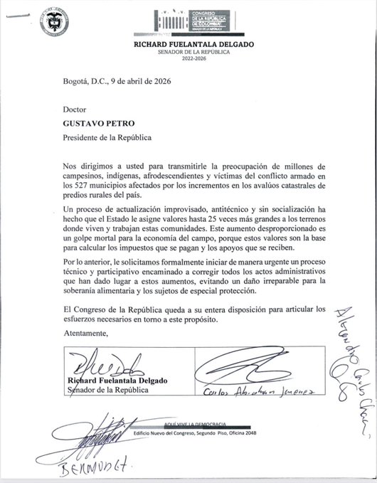 Un grupo de 34 congresistas, encabezados por el senador Richard Fuelantala Delgado, remitió una carta formal al presidente Gustavo Petro para transmitirle la preocupación de millones de campesinos, indígenas, afrodescendientes y víctimas del conflicto armado en los 527 municipios afectados por el incremento en los avalúos catastrales de predios rurales del país.
