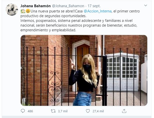 ‘Una nueva puerta se abre!! Casa Acción Interna, el primer centro productivo de segundas oportunidades. Internos, pospenados, sistema penal adolescente y familiares a nivel nacional, serán beneficiarios de nuestros programas de bienestar, estudio, emprendimiento y empleabilidad’, escribió la artista en el trino.
