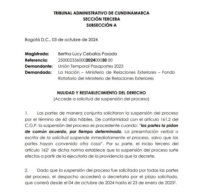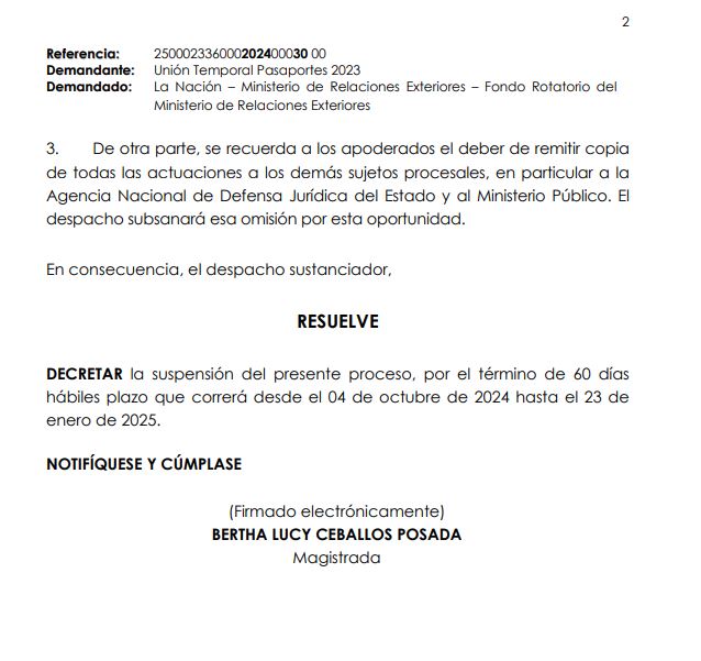 La solicitud de suspensión fue presentada conjuntamente por los apoderados del Fondo Rotatorio del Ministerio de Relaciones Exteriores, del Ministerio de Relaciones Exteriores y de la Unión Temporal Pasaportes 2023.