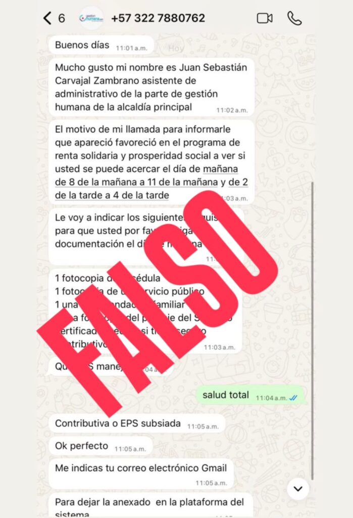 La Alcaldía de Montería prendió las alertas ante la circulación de mensajes fraudulentos por WhatsApp en los que una persona, haciéndose pasar por funcionario de la administración municipal, ofrece supuestos cupos en programas de asistencia social como “Renta Solidaria” y “Prosperidad Social”, y solicita a cambio datos personales, documentos e información de correos electrónicos.