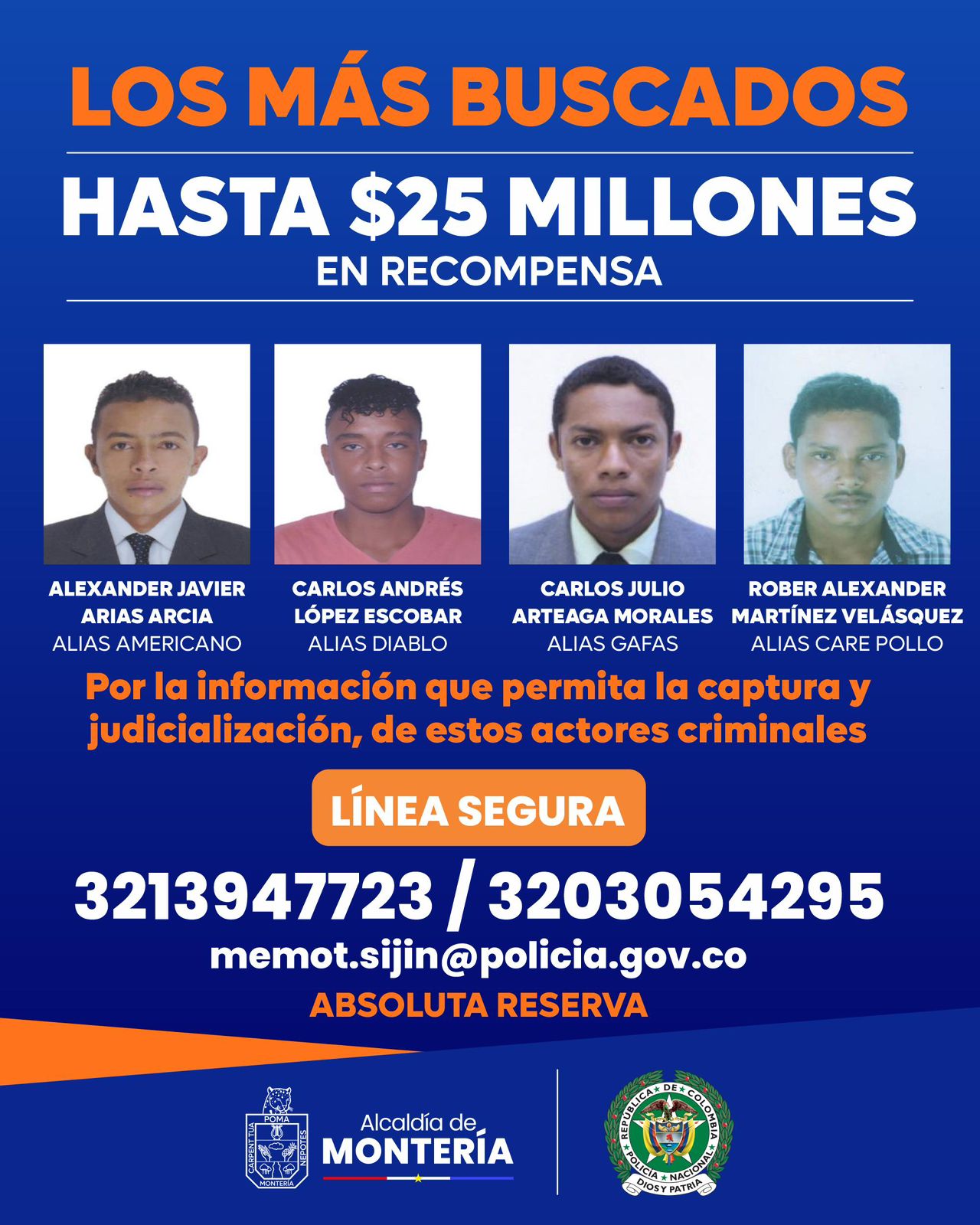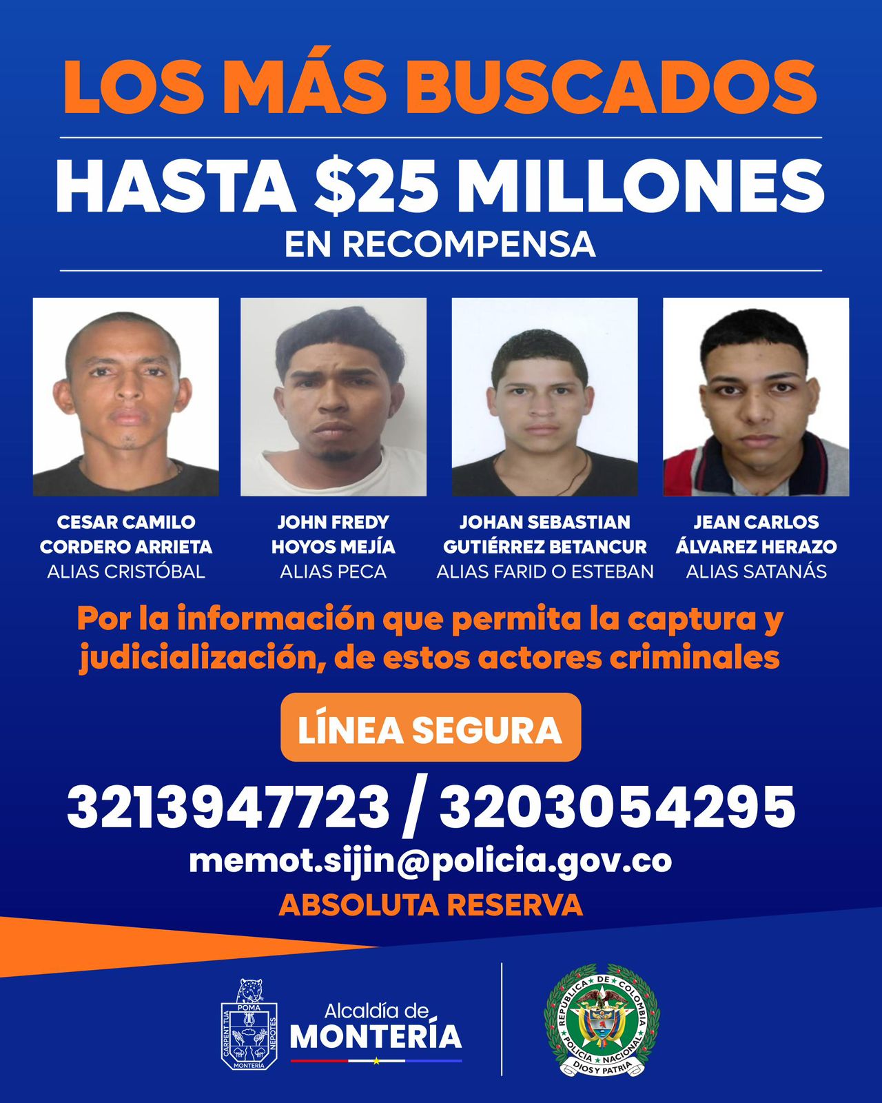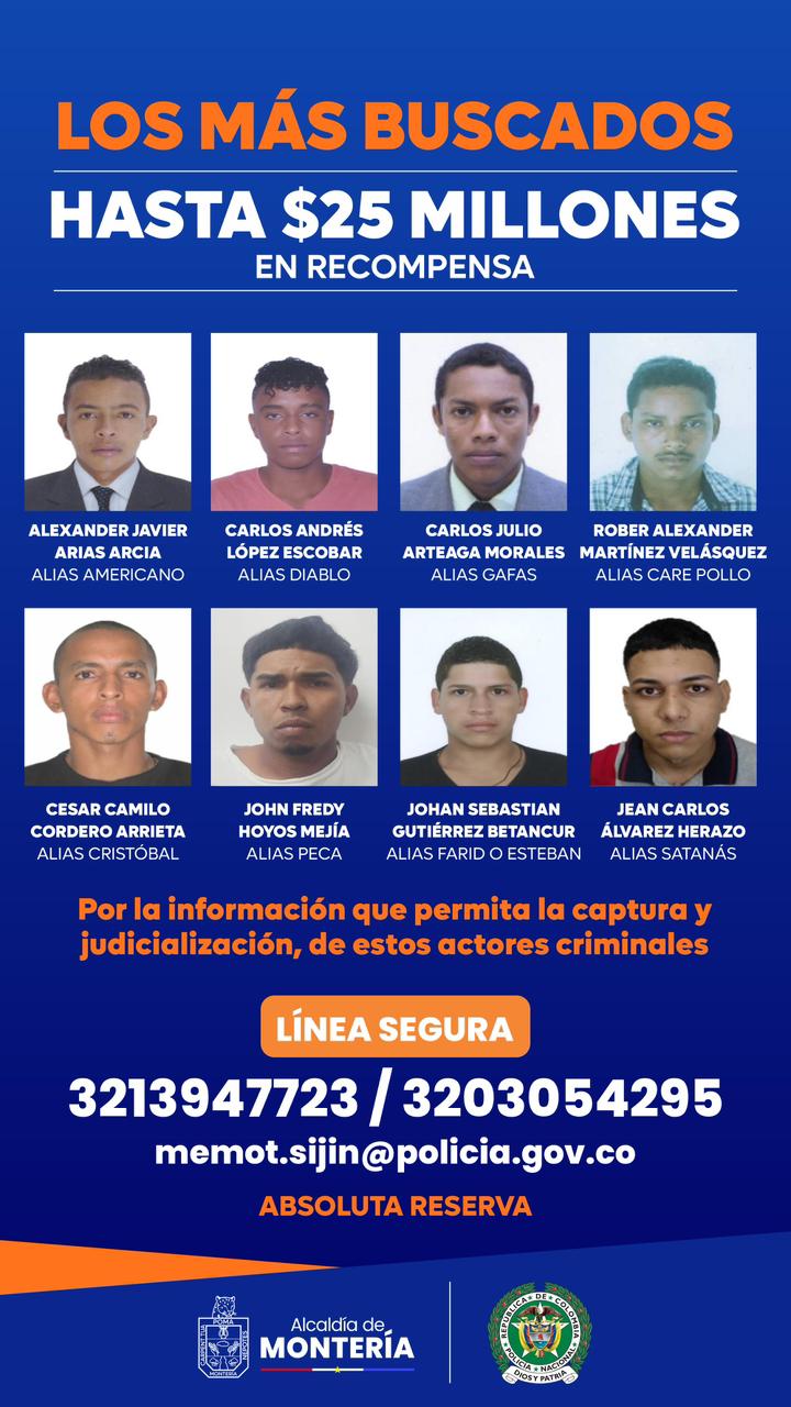 Ocho delincuentes fueron divulgados públicamente como los más buscados en Montería con oferta de recompensa de hasta $25 millones por información que permita su captura y judicialización bajo estricta reserva.
