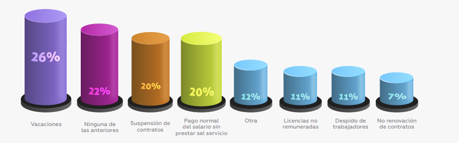 El 26% de las empresas ha optado por las vacaciones colectivas, un 20% de las empresas en Córdoba ha suspendido contratos; otro 20% han pagado normal el salario de los empleados sin prestar el servicio un 11% ha incurrido en despidos y otro 11% en licencias no remuneradas.