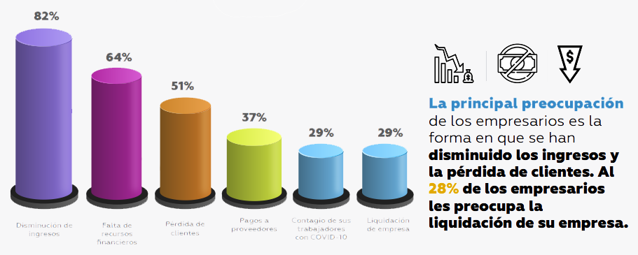 La principal preocupación de los empresarios es la forma en que se han disminuido los ingresos y la pérdida de clientes, al 28% de los empresarios les preocupa la liquidación de su empresa.
