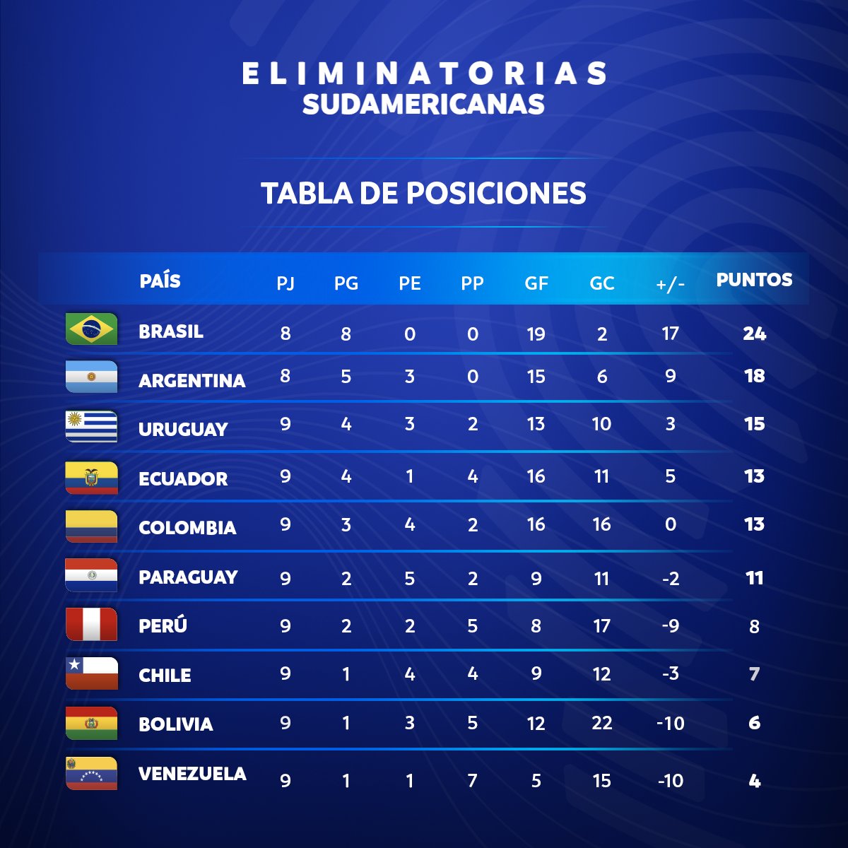 En el 3 lugar encontramos al conjunto de Uruguay con 15 unidades, después sigue la selección ecuatoriana con un total de 13 puntos, Colombia también cuenta con la misma puntuación de Ecuador y busca seguir afianzándose para internar clasificar de forma directa, ya que actualmente la ´tricolor´ se encuentra en el quinto puesto y está en zona de repechaje.