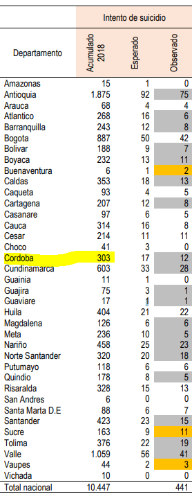 Recientemente el Centro de Estudios Políticos y Socioculturales del Caribe (CEPSCA), advirtió que en los primeros cinco meses del 2018, Córdoba registra un incremento alarmante de 42% en los casos de suicidios consumados, contabilizando a la fecha 37 episodios.