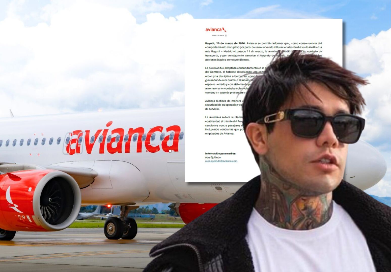 Avianca cancela contrato de transporte a Yeferson Cossio y anuncia acciones legales por artefacto de olor químico