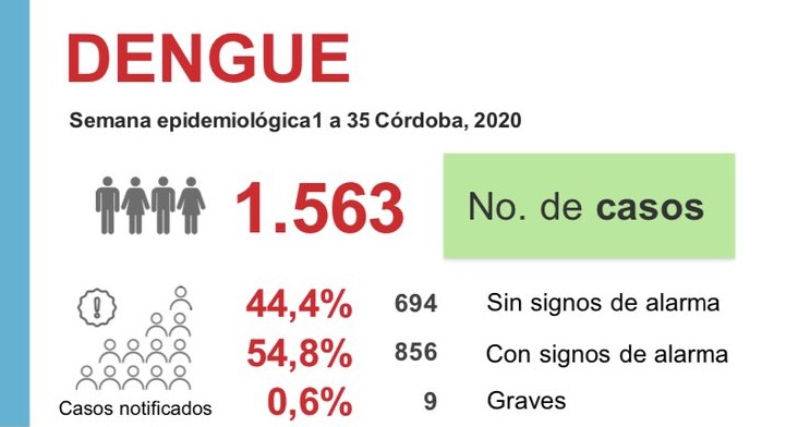 Según los datos suministrados por la Secretaría de Salud Departamental, del total de casos de dengue este año el 44.4% son sin signos de alarma y un 54.8% con signos de alarma, solo el 0.6% de los casos han sido dengue grave.