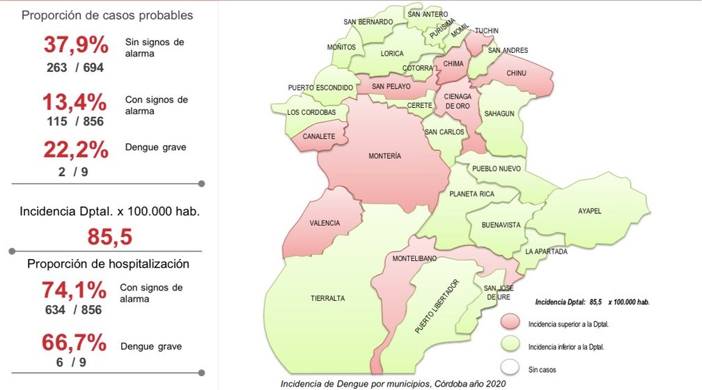 Los municipios que tienen una incidencia de dengue mayor a la departamental son: Montelíbano Valencia, Montería, Canalete, San Pelayo, Chimá, Tuchín, Chinú y Ciénaga de Oro.