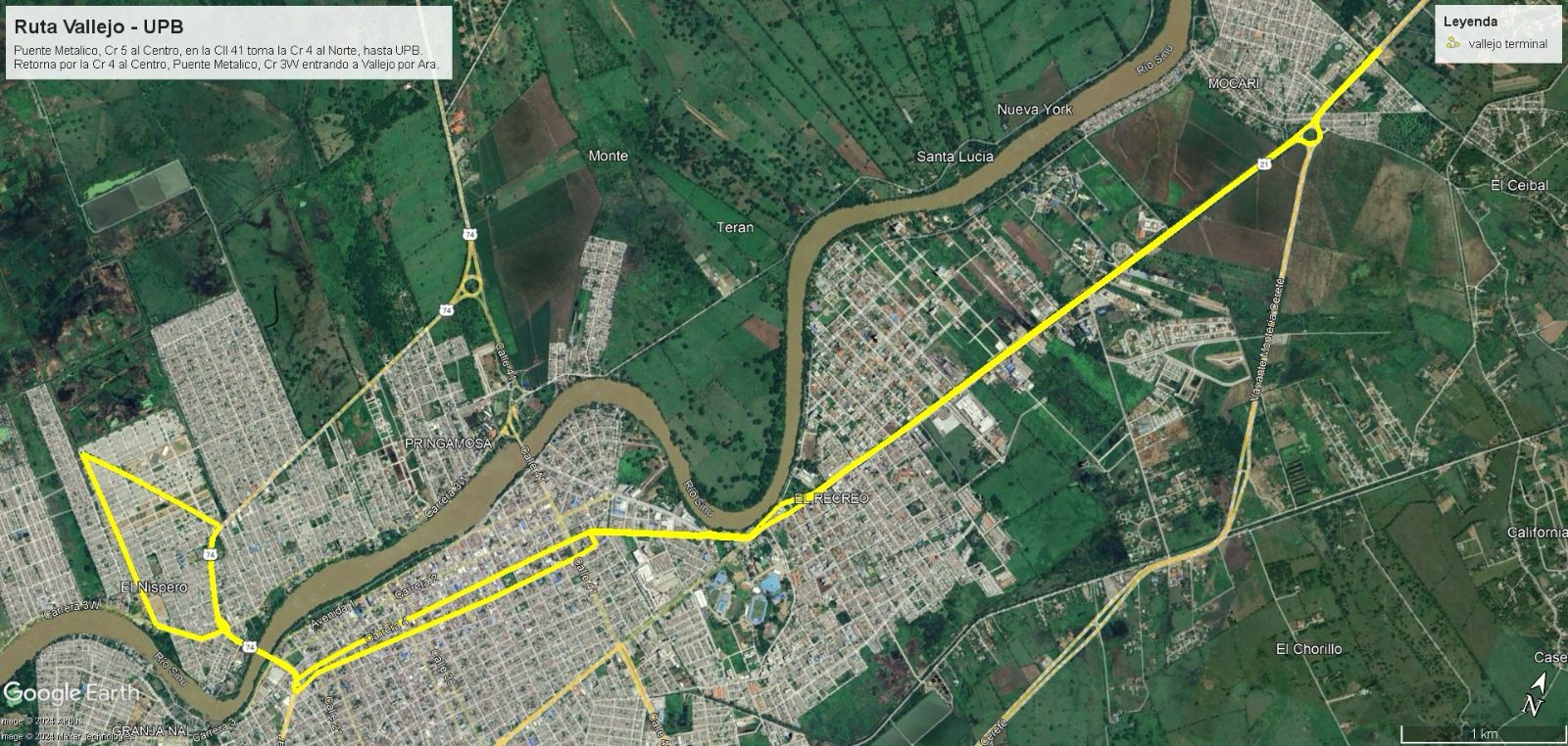 Los vehículos parten del puente metálico sobre el río Sinú, transitan por la carrera 5 hacia el centro, toman la calle 41 y luego la carrera 4 en dirección norte hasta llegar a la Universidad Pontificia Bolivariana (UPB). De allí retornan por la Avenida Circunvalar, descienden nuevamente por la carrera 4 al centro de la ciudad, cruzan el puente metálico y entran a Vallejo por la diagonal 22, concluyendo el recorrido en la carrera 9.