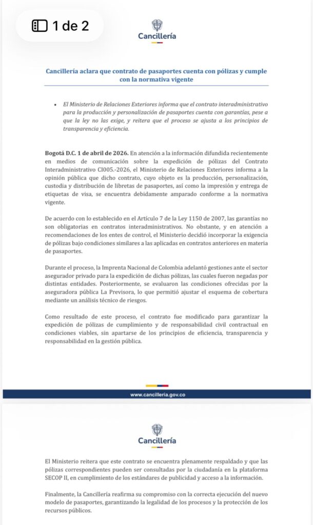 El Ministerio de Relaciones Exteriores salió a responder las dudas sobre el Contrato Interadministrativo CI005-2026, suscrito para la producción, personalización, custodia y distribución de libretas de pasaportes e impresión de etiquetas de visa, y aclaró que el acuerdo cuenta con pólizas de cumplimiento y de responsabilidad civil contractual, pese a que la ley no las exige en contratos de ese tipo.