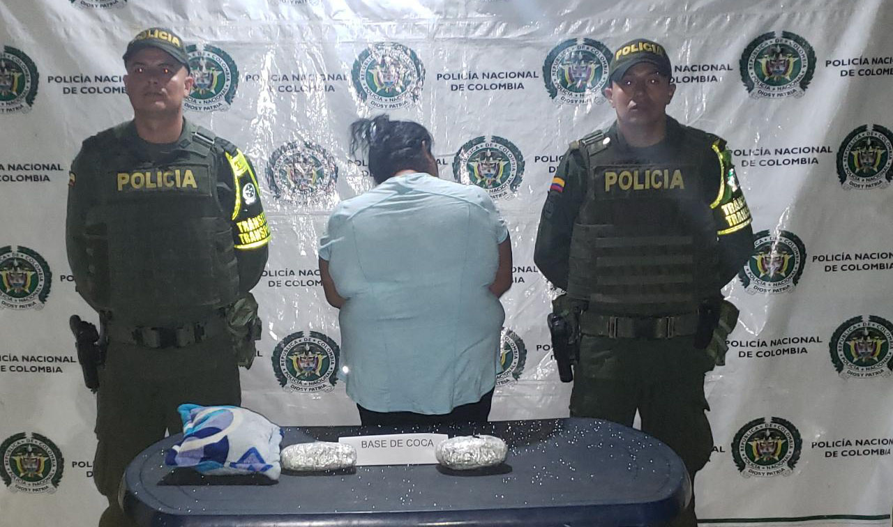 Judicial. La Policía Nacional capturó a una mujer portando más de 1.000 gramos de base de cocaína, estupefaciente que sería distribuido en el departamento de La Guajira.