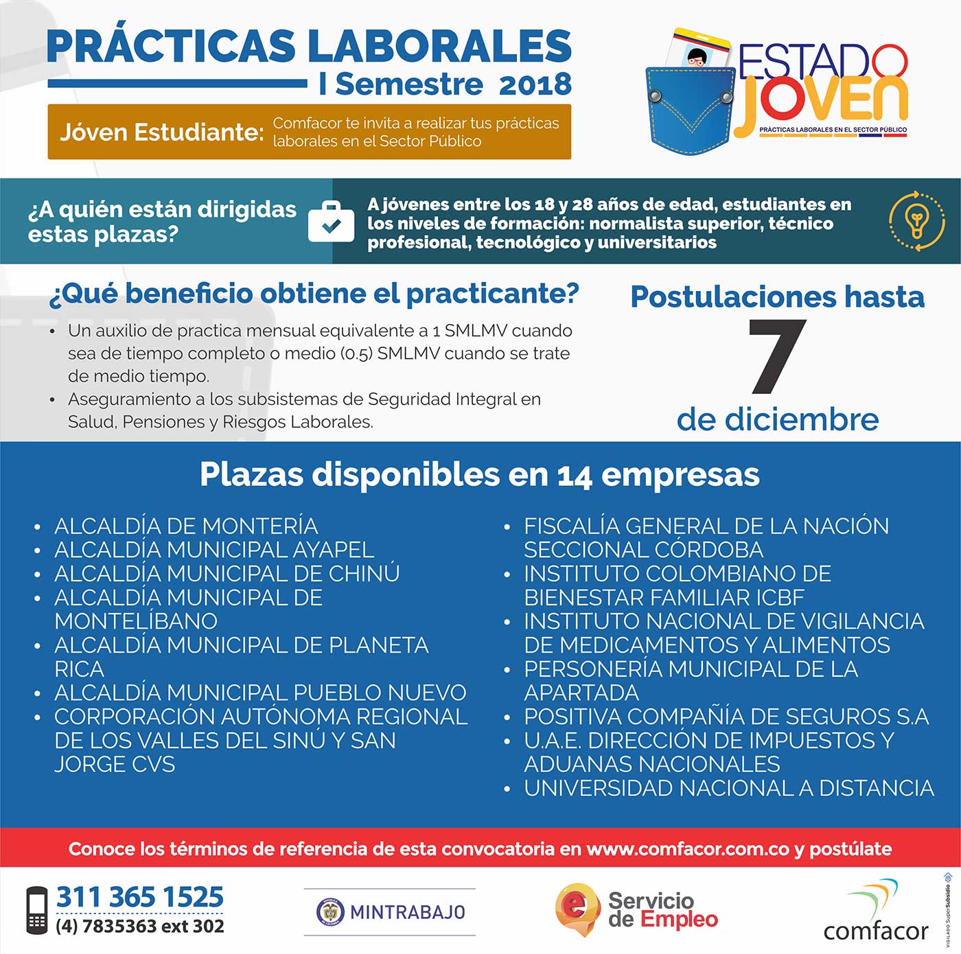 El Centro de Empleo Comfacor abrió la convocatoria en Córdoba para que estudiantes entre los 18 y 28 años de edad, de los niveles Técnico Profesional, Tecnólogo y Universitario, de distintos municipios, puedan acceder a prácticas laborales pagas, en el sector público.