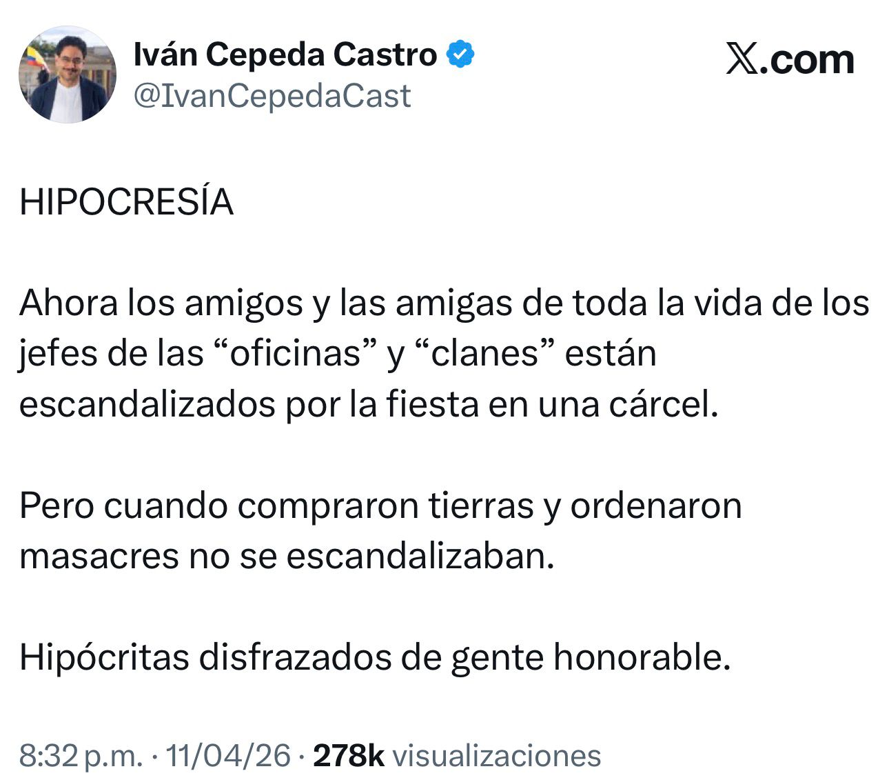 “Ahora los amigos y las amigas de toda la vida de los jefes de las oficinas y clanes están escandalizados por la fiesta en una cárcel. Pero cuando compraron tierras y ordenaron masacres no se escandalizaban. Hipócritas disfrazados de gente honorable”, escribió Cepeda en su cuenta de X.