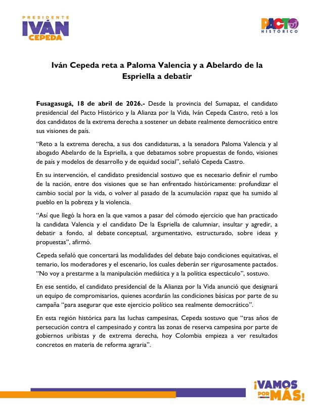 “Reto a la extrema derecha, a sus dos candidaturas, a la senadora Paloma Valencia y al abogado Abelardo De La Espriella, a que debatamos sobre propuestas de fondo, visiones de país y modelos de desarrollo y de equidad social”, señaló Cepeda Castro ante simpatizantes reunidos en esa región de tradición campesina.
