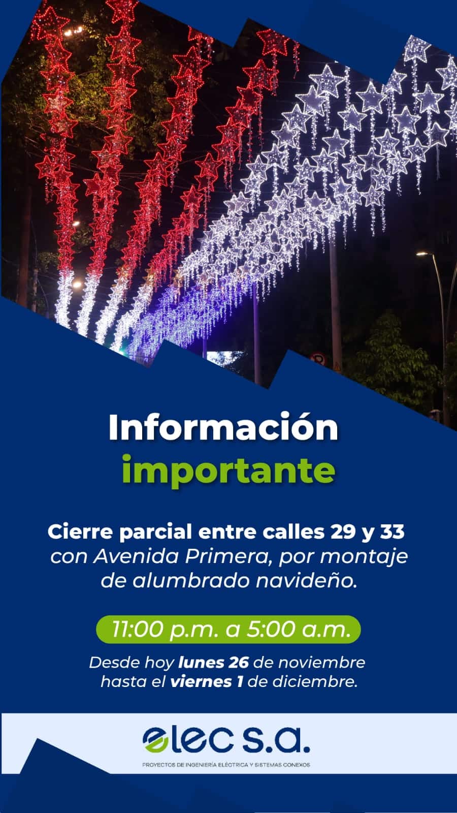 El cierre parcial está programado entre las 11:00 de la noche y las 5:00 de la mañana, permitiendo a los trabajadores de Elec realizar las labores necesarias para engalanar la Avenida Primera con la festiva iluminación navideña.