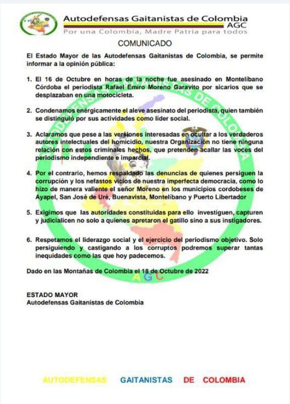 Montería. El grupo paramilitar Clan del Golfo a través de un comunicado negó la autoría del asesinato del líder social y periodista Rafael Moreno Garavito, acaecido en la noche del domingo 16 de octubre en zona urbana del municipio de Montelíbano sur del departamento de Córdoba.