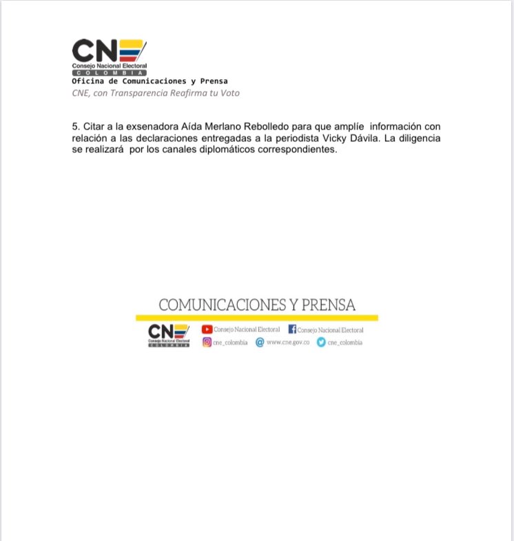 5. Citar a la exsenadora Aída Merlano Rebolledo para que amplíe información con relación a las declaraciones entregadas a la periodista Vicky Dávila. La diligencia se realizará por los canales diplomáticos correspondientes.
