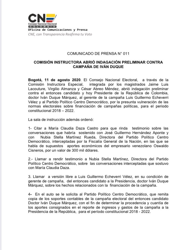 Redacción. El Consejo Nacional Electoral abrió indagación preliminar contra el presidente de la República, Iván Duque, por presunta vulneración de las normas electorales sobre la financiación de campañas políticas para el periodo constitucional 2018- 2022.