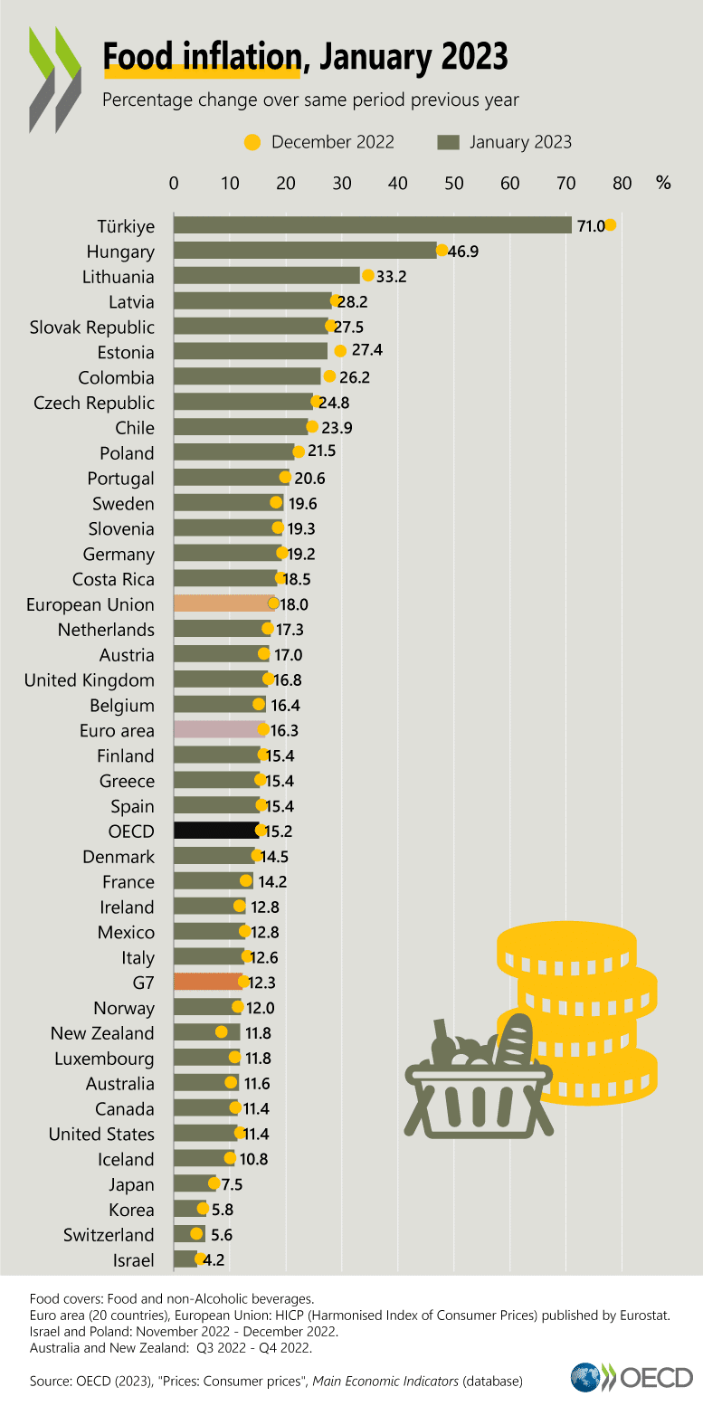 Economía. Un informe revelado recientemente por la Organización para la Cooperación y el Desarrollo Económico (OCDE), evidenció que Colombia es el séptimo país del mundo donde la inflación de los alimentos ha sido más alta en lo que va corrido de este año, con un incremento del 26,2%.