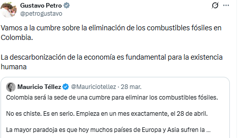 El presidente Gustavo Petro respaldó el evento con un mensaje directo en su cuenta de X: “Vamos a la cumbre sobre la eliminación de los combustibles fósiles en Colombia. La descarbonización de la economía es fundamental para la existencia humana.”