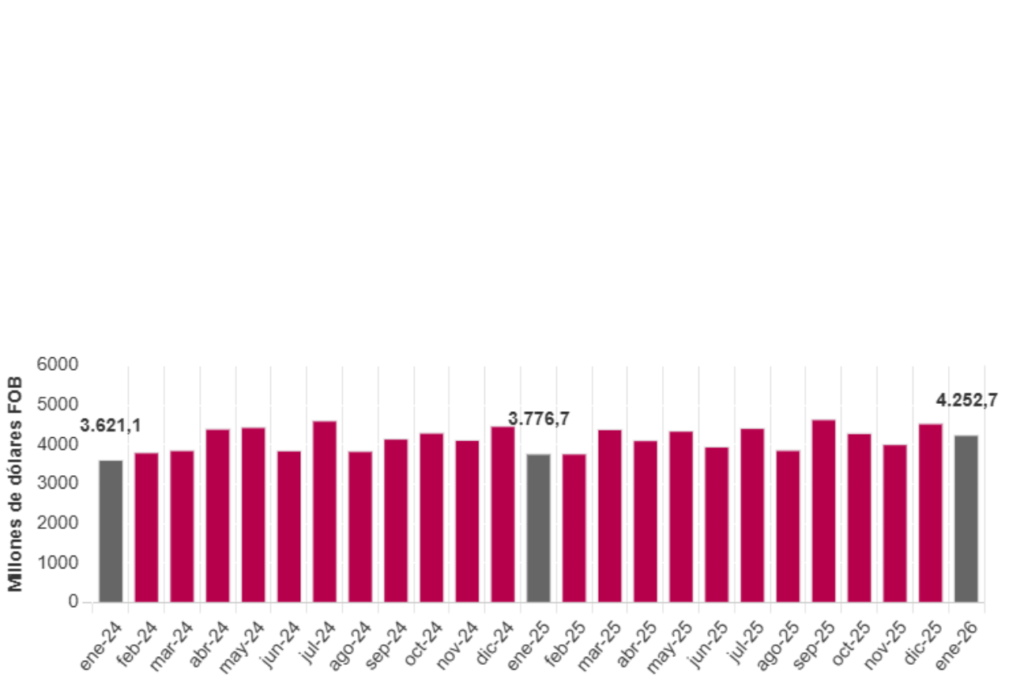 Las exportaciones colombianas arrancaron el año con fuerza. En enero de 2026, las ventas al exterior totalizaron US$4.252,7 millones FOB, un avance del 12,6% frente a los US$3.776,7 millones registrados en el mismo mes de 2025, según datos (DANE) y la (DIAN).