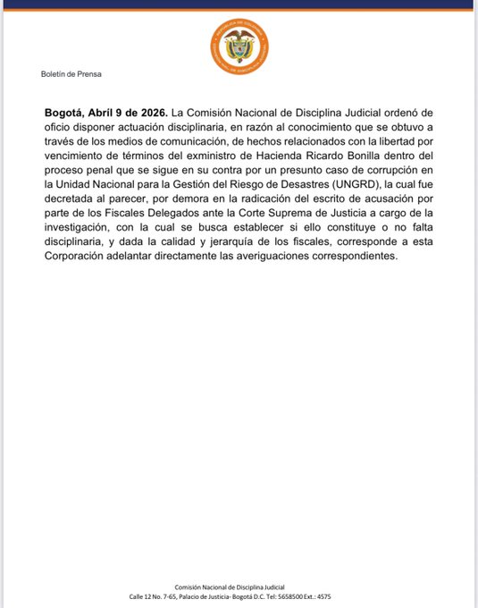 La Comisión Nacional de Disciplina Judicial ordenó de oficio una actuación disciplinaria contra los fiscales delegados ante la Corte Suprema de Justicia a cargo del caso UNGRD, tras conocerse a través de los medios de comunicación que el exministro de Hacienda Ricardo Bonilla González quedó en libertad por vencimiento de términos, al parecer por demoras en la radicación del escrito de acusación.