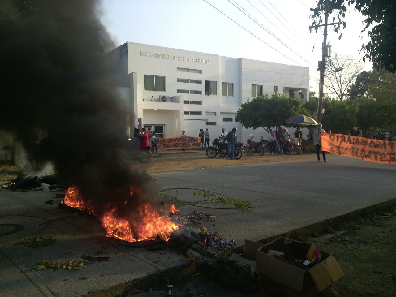 Frente a la ESE Centro de Salud Cotorra, se apostaron desde tempranas horas de este miércoles, 54 extrabajadores de la entidad para reclamar el pago de cerca de cuatro meses de salario más prestaciones sociales que les adeudan desde hace casi dos años; con llantas y madera en medio del fuego bloquearon la vía en espera de una respuesta.