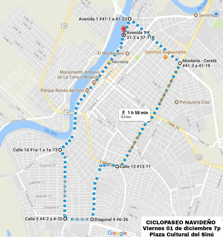 El recorrido del ciclopaseo según la Secretaría de Tránsito, será por toda la Avenida Primera toma la principal de La Granja, sale por la calle 33 empalma con la Avenida Circunvalar, continúa por la calle 41 y finaliza en el la Plaza Cultural del Sinú.