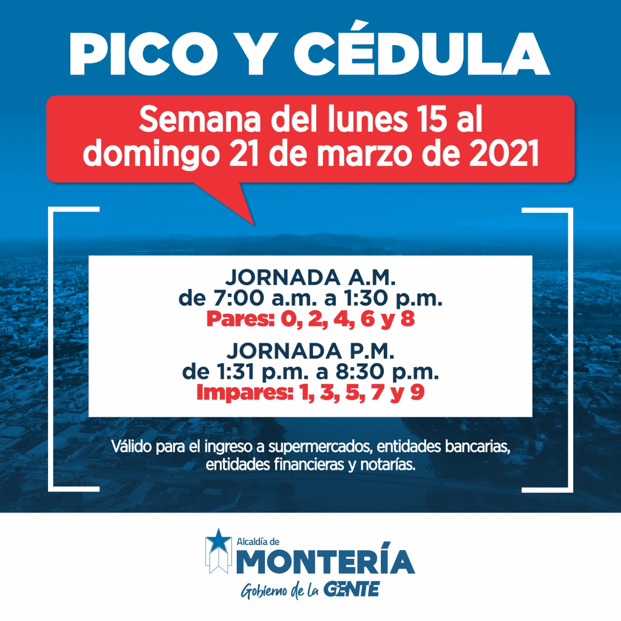 Redacción. La Alcaldía de Montería dio a conocer la medida de pico y cédula que regirá a partir de este lunes 15 de marzo y hasta el 21 del mismo mes para el ingreso a supermercados, almacenes de cadena, establecimientos comerciales, entidades bancarias, financieras y notarías.