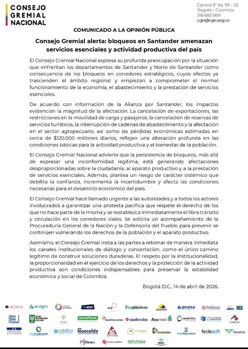 El Consejo Gremial Nacional expresó este martes su profunda preocupación por los bloqueos que afectan los departamentos de Santander y Norte de Santander, advirtiendo que los cierres en corredores estratégicos generan pérdidas económicas estimadas en cerca de 120.000 millones de pesos diarios y comprometen el normal funcionamiento de la economía, el abastecimiento y la prestación de servicios esenciales en el país.