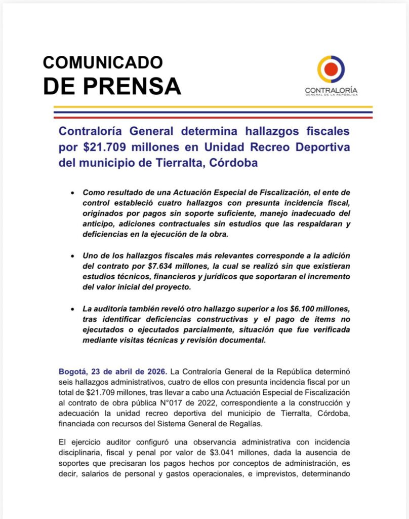 La Contraloría General de la República identificó hallazgos fiscales por 21.709 millones de pesos en la Unidad Recreo Deportiva del municipio de Tierralta, Córdoba, tras una Actuación Especial de Fiscalización que evidenció irregularidades en la ejecución del proyecto.