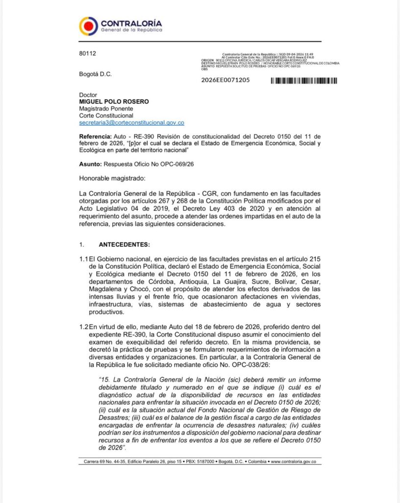 La Contraloría General de la República remitió un documento a la Corte Constitucional en el marco de la revisión de exequibilidad del Decreto 0150 del 11 de febrero de 2026, mediante el cual el Gobierno Nacional declaró el Estado de Emergencia Económica, Social y Ecológica en los departamentos de Córdoba, Antioquia, La Guajira, Sucre, Bolívar, Cesar, Magdalena y Chocó, tras las intensas lluvias e inundaciones que afectaron viviendas, infraestructura, vías y sistemas de abastecimiento de agua.
