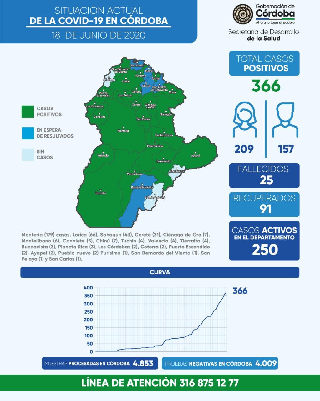 Los cuatro municipios con más casos de coronavirus a la fecha son: Montería con 179 casos, Lorica con 66; Sahagún, 43 y Cereté 21 casos.