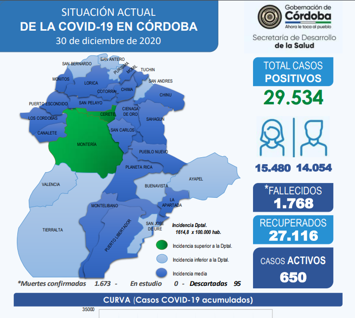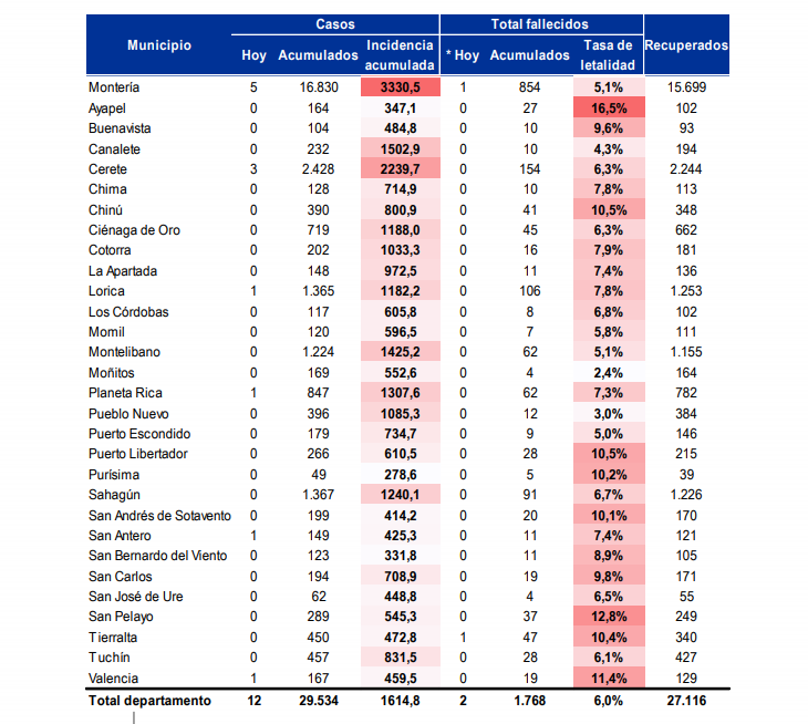 Montería con 16.830 es el municipio con más casos, de esos han muerto 854 pacientes y se han recuperado 15.699.