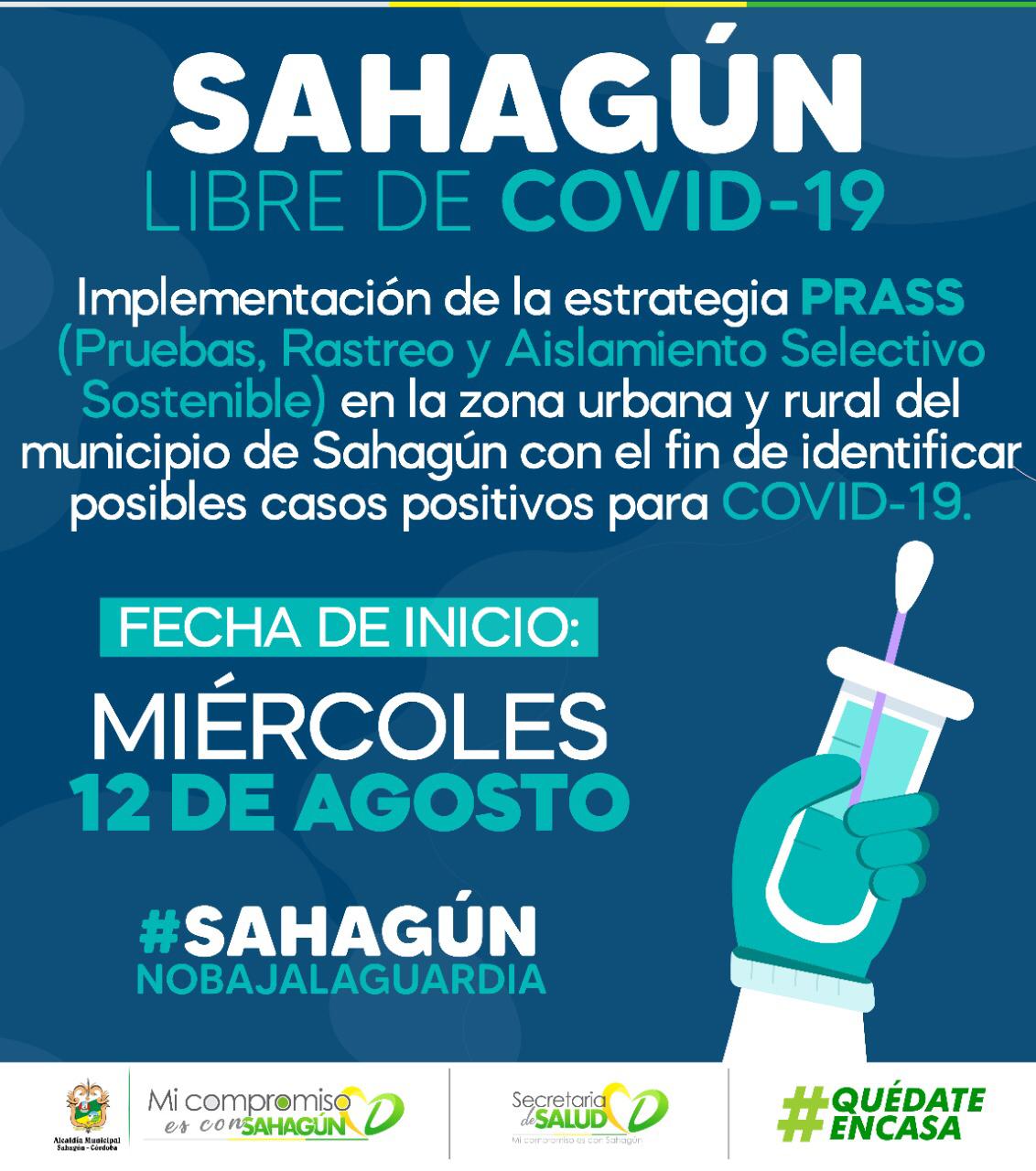 Redacción. La Alcaldía de Sahagún informó que con el fin de contener la cadena de transmisión de contagios y fortalecer respuesta frente a identificación oportuna de casos positivos para COVID-19 se pondrá en marcha la estrategia de Pruebas, Rastreo y Aislamiento Selectivo Sostenible, PRASS.