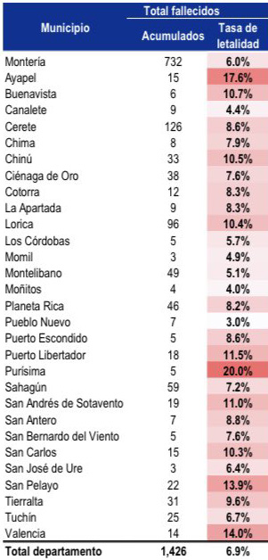 Por municipios, Montería es el que más fallecimientos acumula con 732 y una tasa de letalidad del 6.0%.
