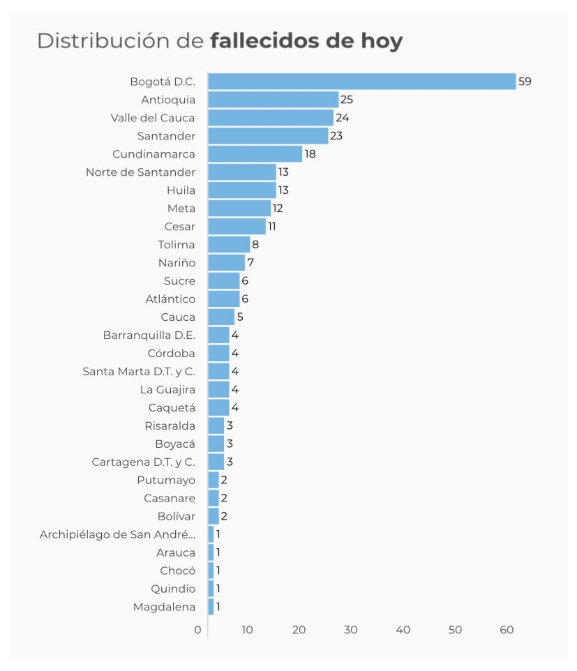 La distribución de fallecidos se concentra principalmente en Bogotá, Antioquia, Valle del Cauca, Santander y Cundinamarca. (Ver gráfico).