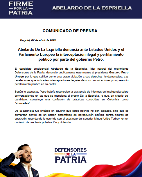 El candidato presidencial Abelardo de la Espriella denunció ante instancias internacionales supuestas interceptaciones ilegales y un presunto perfilamiento político en su contra, hechos que atribuyó al Gobierno Nacional liderado por Gustavo Petro.