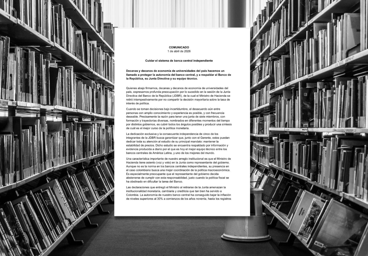Decanas y decanos de facultades de Economía de distintas universidades del país emitieron un pronunciamiento en el que solicitan proteger la autonomía del Banco de la República y respaldar a su Junta Directiva ante recientes tensiones con el Gobierno Nacional.