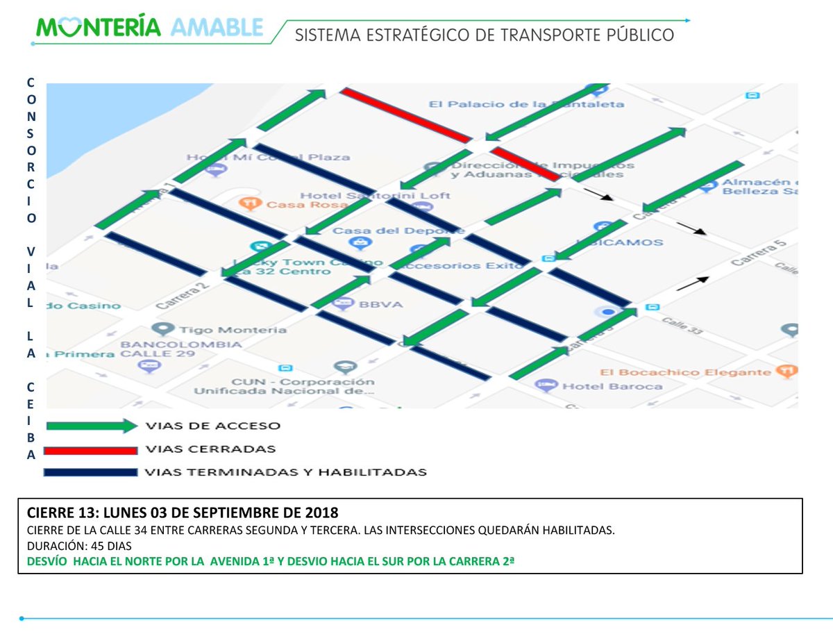 Montería. A partir del lunes 3 de septiembre se realizará el cierre de la calle 34 entre carreras segunda y tercera, para continuar con las obras de reconstrucción de la malla vial del centro de la ciudad.