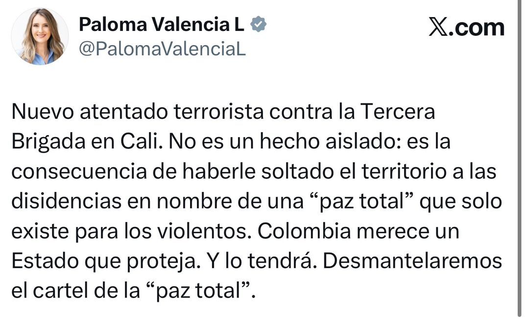 A través de su cuenta en la red social X, Valencia calificó el hecho como un nuevo atentado terrorista y rechazó cualquier lectura que lo presente como un hecho aislado. Para la candidata, el ataque es una consecuencia directa de la política de paz total impulsada por el Gobierno del presidente Gustavo Petro, a la que responsabilizó de haber cedido control territorial a las disidencias de las FARC.