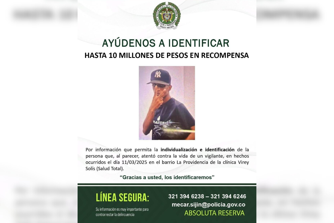 La Alcaldía de Cartagena ofrece hasta 10 millones de pesos a quien suministre información que permita ubicar al hombre que disparó seis veces contra un vigilante de la IPS Virrey Solís en la madrugada de este miércoles 11 de marzo, luego de que le impidieran ingresar como acompañante de una paciente en urgencias.