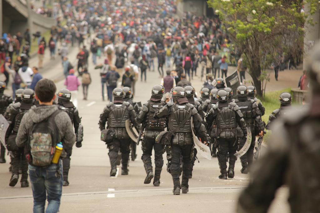 La Policía Nacional designó unos 9.500 uniformados para acompañar las marchas en Bogotá y en el resto de ciudades donde se adelantan marchas, con el acompañamiento de drones, helicópteros y cámaras.