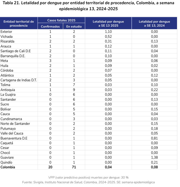 El departamento de Córdoba registra 2 muertes confirmadas por dengue y 2 casos más en estudio, según el último Boletín Epidemiológico Semanal del Instituto Nacional de Salud (INS) correspondiente a la semana 13.