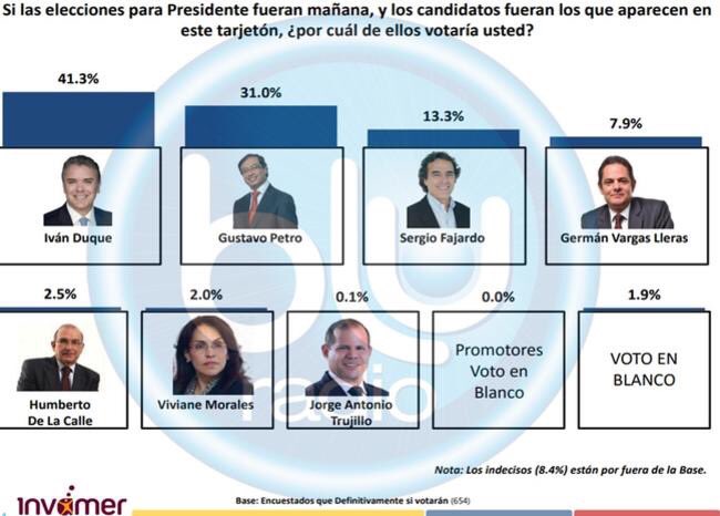 La más reciente encuesta de la firma Invamer para la alianza Semana, Noticias Caracol y Blu Radio revela que los dos candidatos presidenciales que pasarían a segunda vuelta, serían Iván Duque por el partido Centro Democrático y Gustavo Petro, por la Colombia Humana, con un 41.3% y 31%, respectivamente, según la intención de voto de los colombianos a solo un mes de la primera vuelta, a celebrarse el 27 de mayo.
