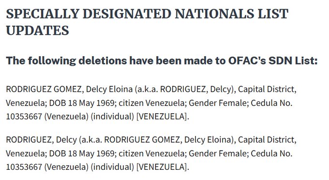 El gobierno de Estados Unidos levantó este miércoles las sanciones contra Delcy Rodríguez, presidenta interina de Venezuela, al eliminar su nombre de la Lista de Nacionales Especialmente Designados que administra la Oficina de Control de Activos Extranjeros (OFAC) del Departamento del Tesoro.