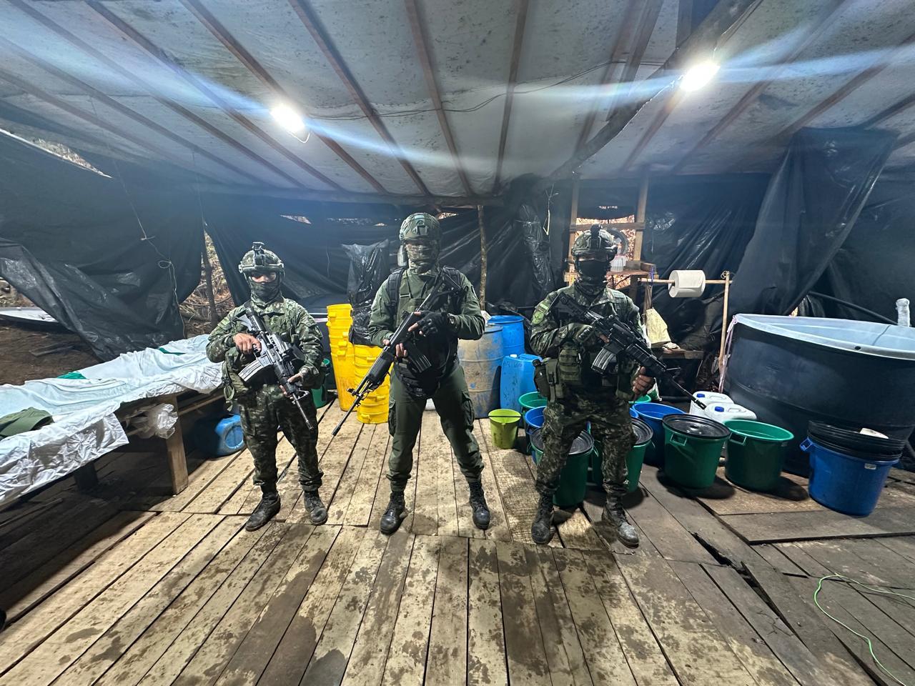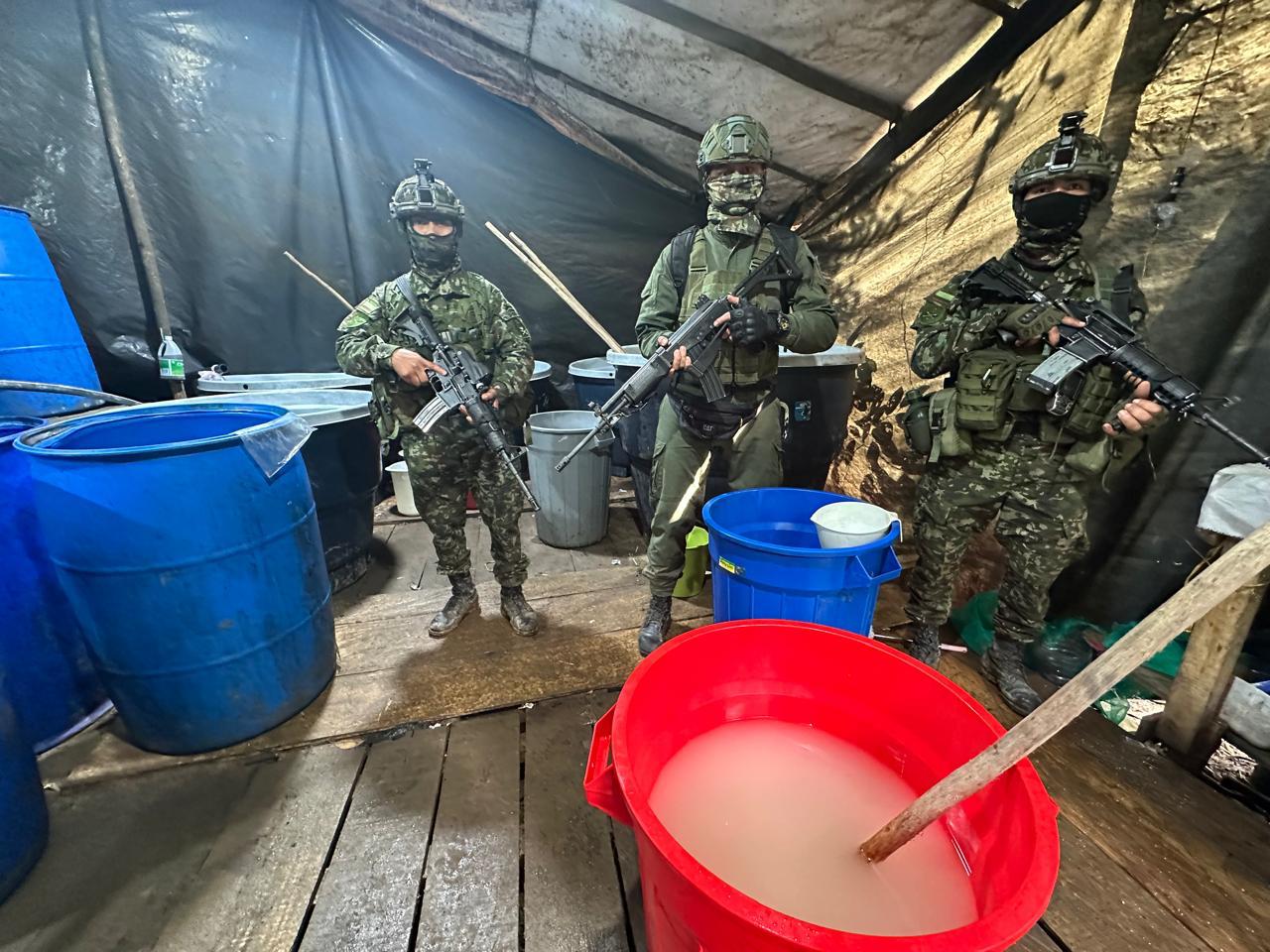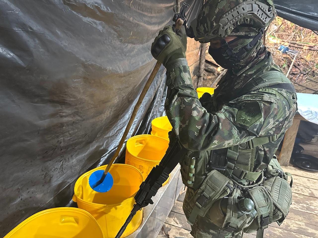 El complejo estaba conformado por seis estructuras rústicas destinadas al procesamiento de clorhidrato de cocaína. Durante el procedimiento, las tropas incautaron 409 kilogramos de la sustancia ya procesada, 1.526 galones de cocaína en proceso y 765 galones de insumos líquidos, además de 150 kilogramos de sustancias sólidas. También fueron hallados dos destiladores artesanales —conocidos como marcianos— y un filtrador o gusano, equipos esenciales en la cadena de producción del alcaloide.