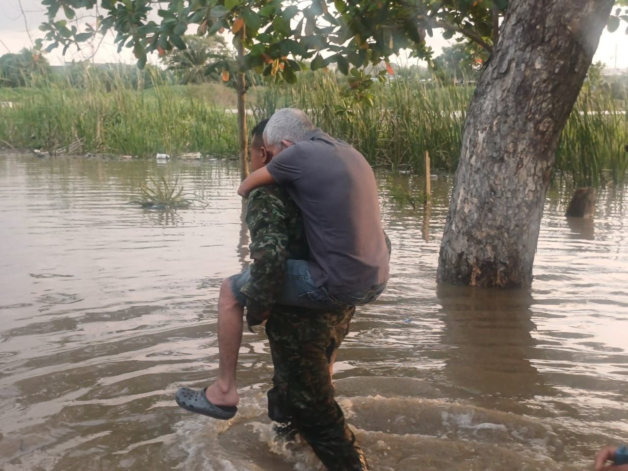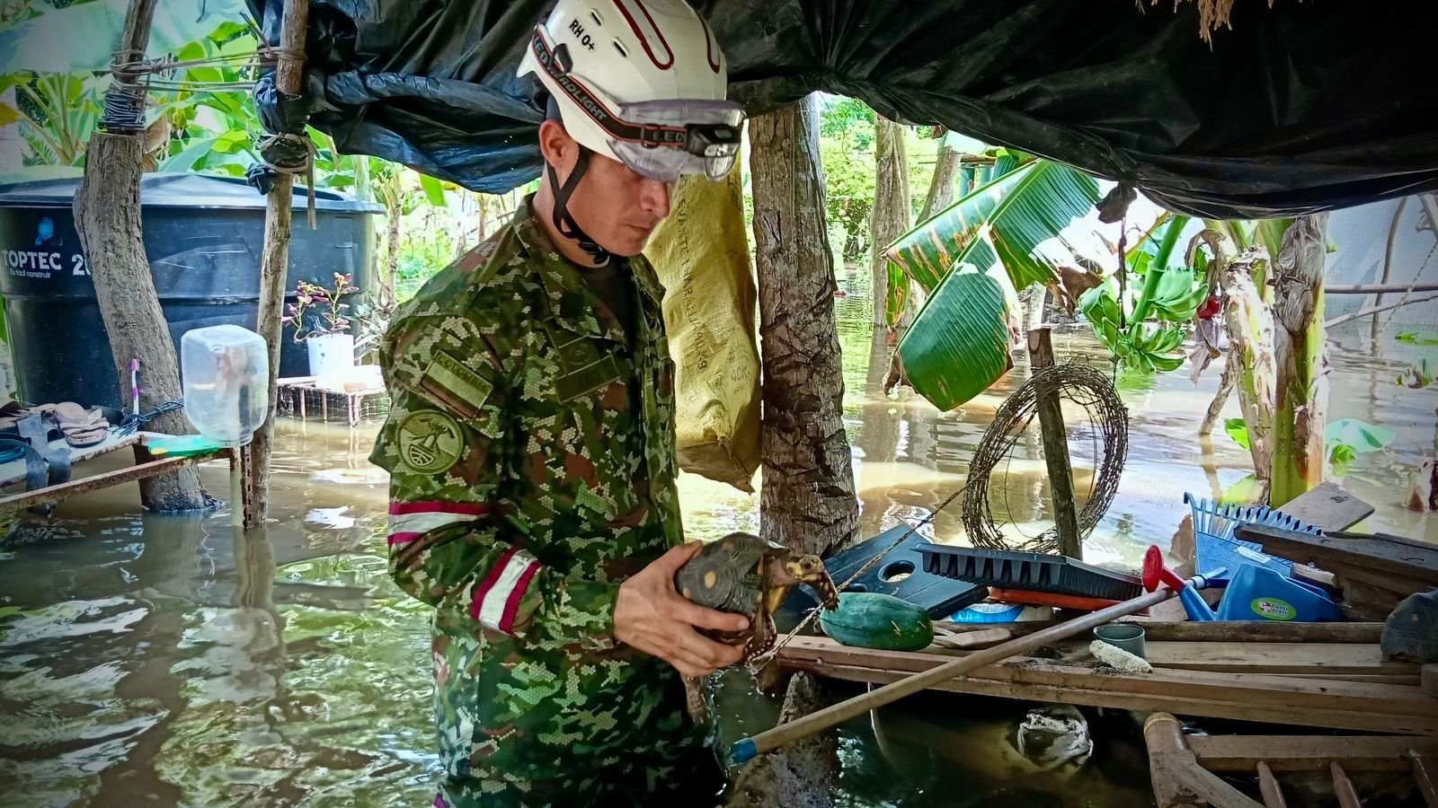 Los soldados también rescatan animales que quedaron en situación de riesgo. Numerosos ejemplares fueron evacuados junto a sus propietarios hacia zonas seguras, mientras otros fueron salvados tras quedar a la deriva por las condiciones que enfrenta la región.